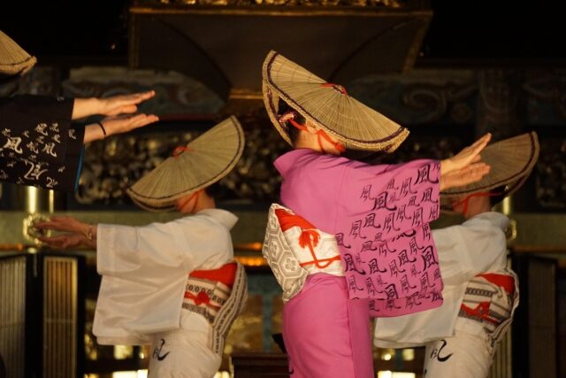 踊り手は編笠をかぶり、顔を少しかくした姿で、三味線や胡弓、太鼓の音に合わせて、ゆっくりと踊ります。大きな動きは少なく、手や足の動きがとてもやさしく、上品なのが特徴です。夜になると、町のあかりと提灯の光に包まれ、静かで幻想的な雰囲気になります。