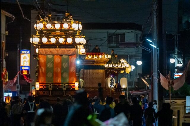 この祭りの一番の見どころは、豪華な山車です。山車の上には歴史上の人物の人形がのせられ、笛や太鼓のおはやしとともに町を進みます。夜になると山車に明かりが入り、昼とはちがう美しさを楽しむことができます。