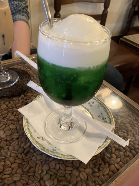 今日注文したのは「クリームソーダ」。喫茶店に行くと珈琲かレモネードかクリームソーダをよく注文しています。こちらの喫茶店のクリームソーダは、あまり炭酸が強くなく、あまみが強いクリームソーダでした。普段よく見かけるのがドリンクバーのメロンソーダやクリームソーダなので、少々濃いソーダ水という印象でした。アイスも濃い味のバニラアイス。喫茶店に行った日が暑かったので程よく涼めて、ゆったりと時間を過ごせました。こちらの喫茶店は軽食はあまり多くないですが、珈琲も美味しいのでゆっくりとくつろぎながらおしゃべりを楽しみたいときには一度行かれてはいかがでしょうか?