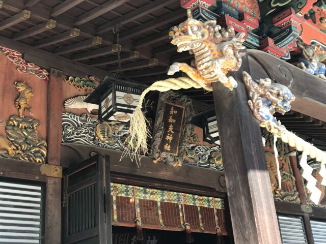 秩父神社の本殿の右側にあるのがこの「つなぎの龍」です。昔天ケ池という池がありました。その池にすみついた龍が暴れた時は、必ずこの彫刻の下に水たまりができたそうです。この彫刻の龍を鎖で繋ぎとめたところ、その後龍は現れなかったという伝説があるそうです。この青い龍の彫刻こそ伝説に語られている「つなぎの龍」の姿といわれているそうです。