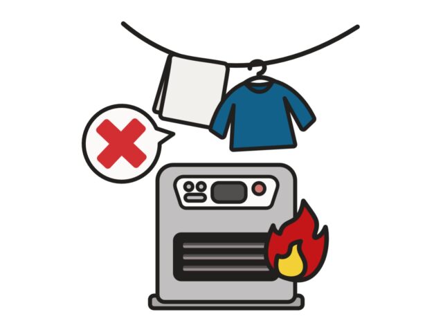 まず大切なのは、暖房器具の周りに物を置かないことです。特に洗濯物を近くに干すのはとても危険です。洗濯物が熱で乾きやすいと思いがちですが、服やタオルが触れると、火がついたり、焦げたりすることがあります。見ていない間に火事になるおそれもあるため、絶対に近くに干さないようにしましょう。
